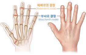 - 골관절염(Osteoarthritis): 연골 마모로 인해 관절이 뻑뻑하고 소리가 나기도 하며, 주로 DIP, PIP, 엄지뿌리 관절에 발생합니다 :contentReference[oaicite:2]{index=2}.