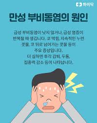 | 증상 지속 | 갑자기 심해지고 열 동반 가능 | 지속적 코막힘, 후비루, 두통 |